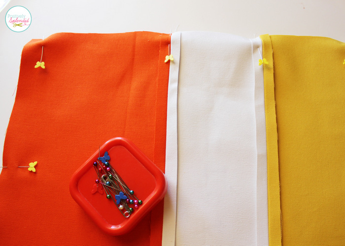 Align 1 of the 8×14″ orange duck pieces with the long edge of the white section so that the right sides are facing. Pin, stitch, and press seams open. Repeat with the remaining white, orange and yellow duck pieces so that you have 2 complete assembled panels for the front and back of the tote.