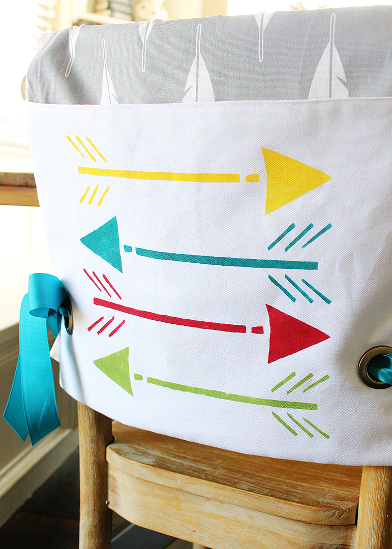 FolkArt has a variety of 12-inch stencil sets that are perfect for using with this particular project, since the designs are perfectly sized for the pocket front. For my chair backers today, I used a teepee and an arrow motif from the FolkArt Modern Variety Pack stencil set. I plan to use my chair backers for the kids’ table this Thanksgiving, and these designs go perfectly with a Thanksgiving theme!