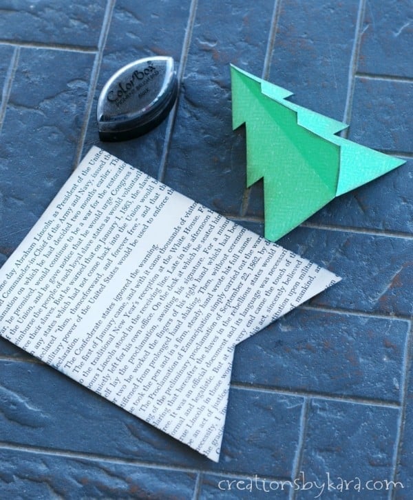 To add some dimension, ink the edges of your book pages and trees with an ink pad. I used a tiny black pad, the small size makes it easier to get in the corners. But you can use whatever you have. Or you can totally omit this step if you prefer.