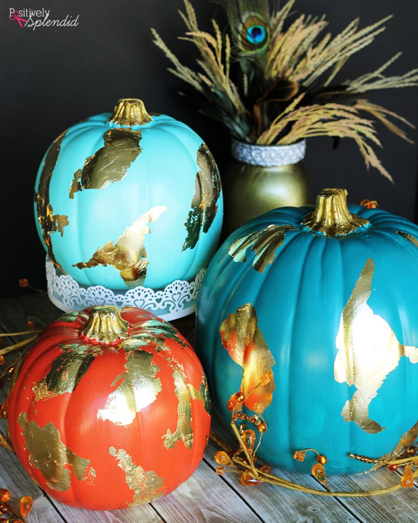 This same process of applying adhesive/applying the gilding/brushing away the excess works for any design, regardless of whether you choose to do random shapes like I did in my pumpkins below, a hand drawn-design like my jack-o-lantern above, or even a stenciled or more intricate design.