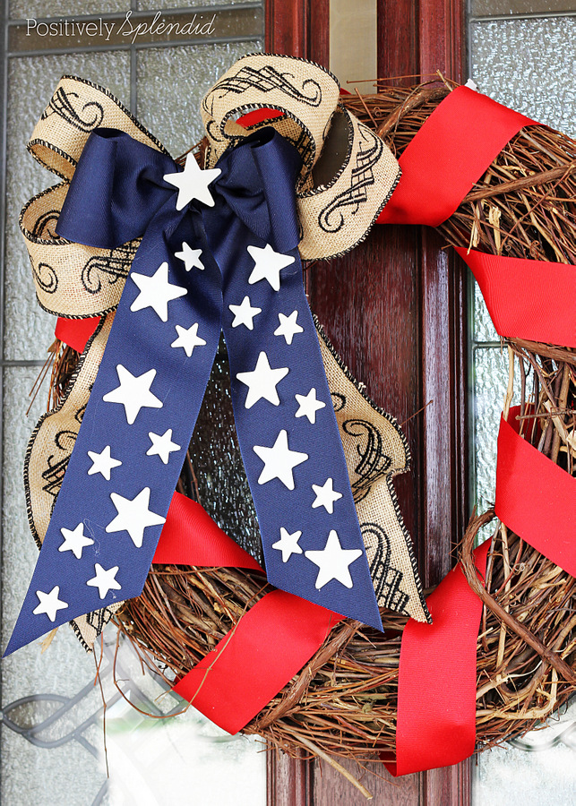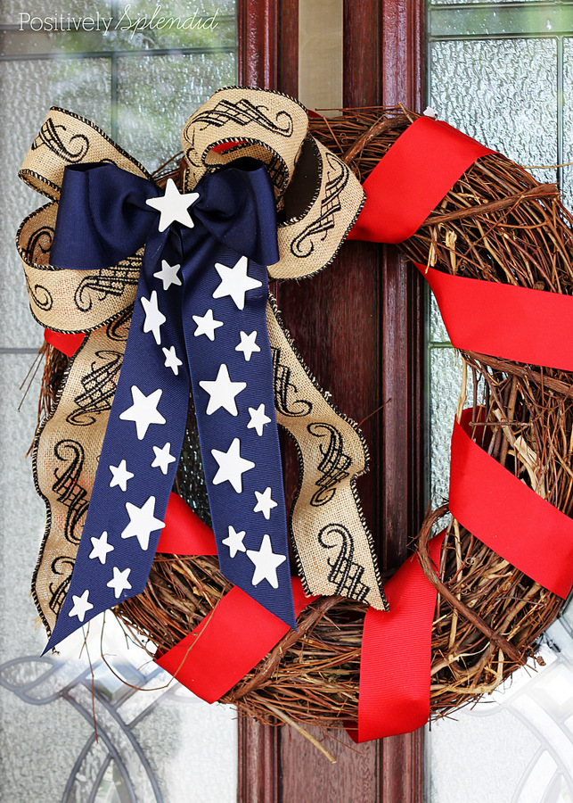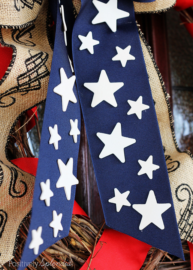 - Tie a bow with the navy grosgrain ribbon, leaving two long tails. Use hot glue to affix the painted stars to the tails in a random pattern. Affix an additional star to the center of the bow, and then affix the bow to the wreath with hot glue, positioning it on top of the burlap bow.