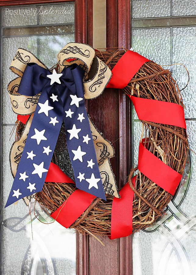Add a festive touch of red, white and blue to your home this summer by crafting this patriotic stars and stripes wreath. A whimsical take on the American flag, this wreath features red ribbon stripes and a spray of white stars on a navy grosgrain bow. This wreath makes such a statement, you’ll never believe how easy it is to make!